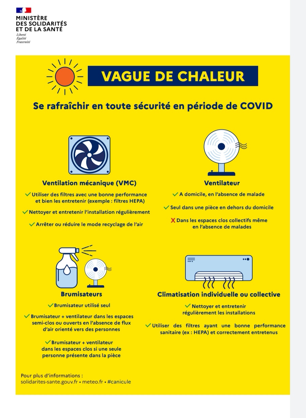 - rafraîchissez-vous le corps plusieurs fois par jour. Il n’y a pas de contre-indication à utiliser la climatisation si celle-ci est bien entretenue. Seul le ventilateur dans les espace collectifs où se trouvent plusieurs personnes n’est pas recommandé dans le contexte COVID. Plus d’infos : Se rafraîchir en toute sécurité