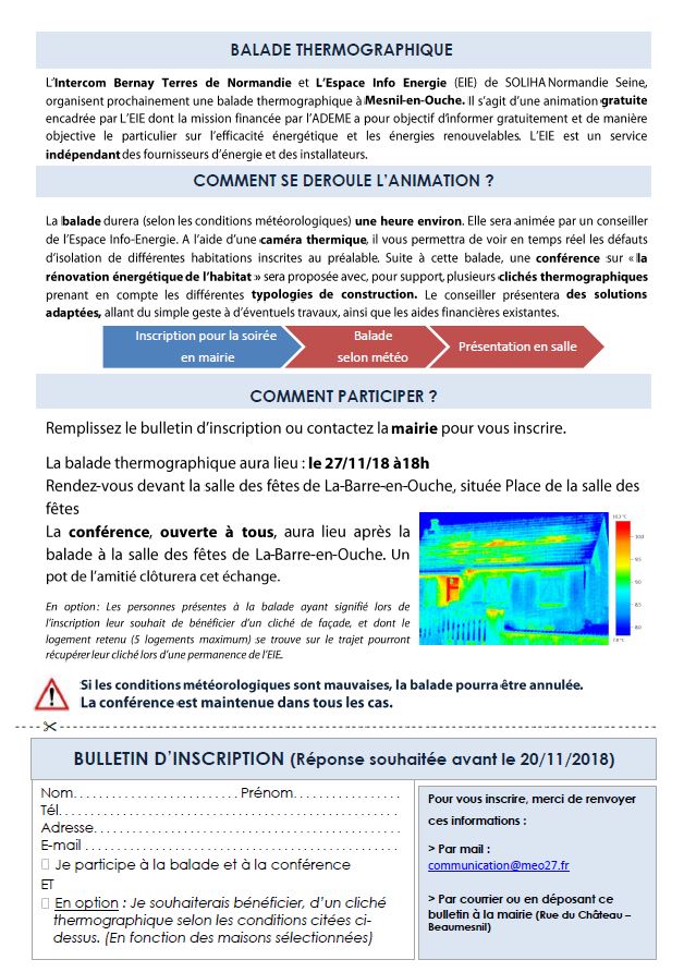 L’Intercom Bernay Terres de Normandie et l’Espace Info Energie (EIE) de SOLIHA Normandie Seine, organise une balade thermographique dans la commune déléguée de La Barre-en-Ouche suivie d’une conférence sur la rénovation énergétique de l’habitat.