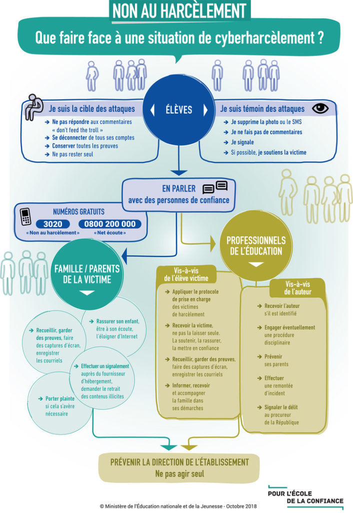 - 3020 « Non au harcèlement » du lundi au vendredi de 9h à 20h et le samedi de 9h à 18h (sauf jours fériés). Pour accueillir les jeunes ou les parents, victimes ou témoins de harcèlement à l’école