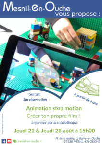La médiathèque vous propose une animation stop motion » créer ton propre film « , le jeudi 21 & jeudi 28 août 2025 à 15h00.