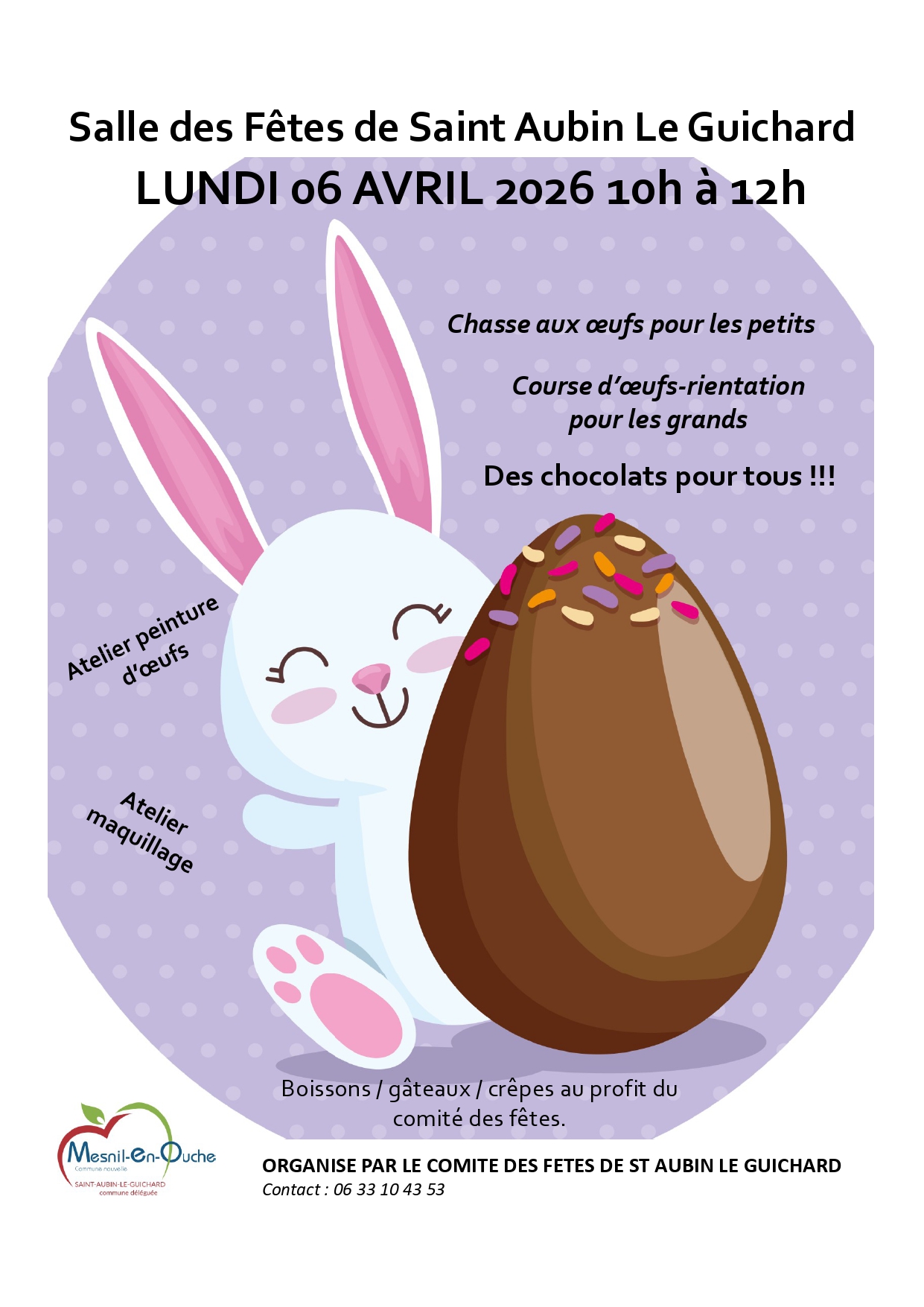 Vous êtes ici : Accueil » Notre territoire » Agenda » Chasse aux œufs de Saint-Aubain-Le-Guichard