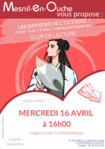 La médiathèque vous propose le mercredi 16 avril à 16h un club de lecture pour les 13 à 17 ans » Les rêveurs de l’odyssée ! « .