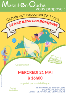 La médiathèque vous propose le mercredi 21 mai à 16h un club de lecture pour les 7 à 11 ans » Le nez dans les bouquins « .