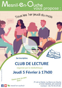 La médiathèque de Mesnil-en-Ouche vous propose un club lecture sur inscription le jeudi 5 février 2026 à 17h00.