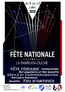 Le comité des fêtes de La Barre-en-Ouche vous propose une fête foraine, un défilé et Commémoration suivi d’un feu d’artifice du 8 au 14 juillet 2025.