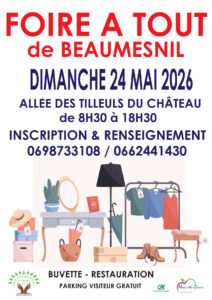 Le comité des fêtes de Beaumesnil, vous propose une foire à tout le dimanche 24 mai 2026.