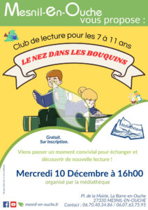 La médiathèque de Mesnil-en-Ouche vous propose un club de lecture « Le nez dans les bouquins » pour les 7 à 11 ans, le mercredi 10 décembre à 16h00.