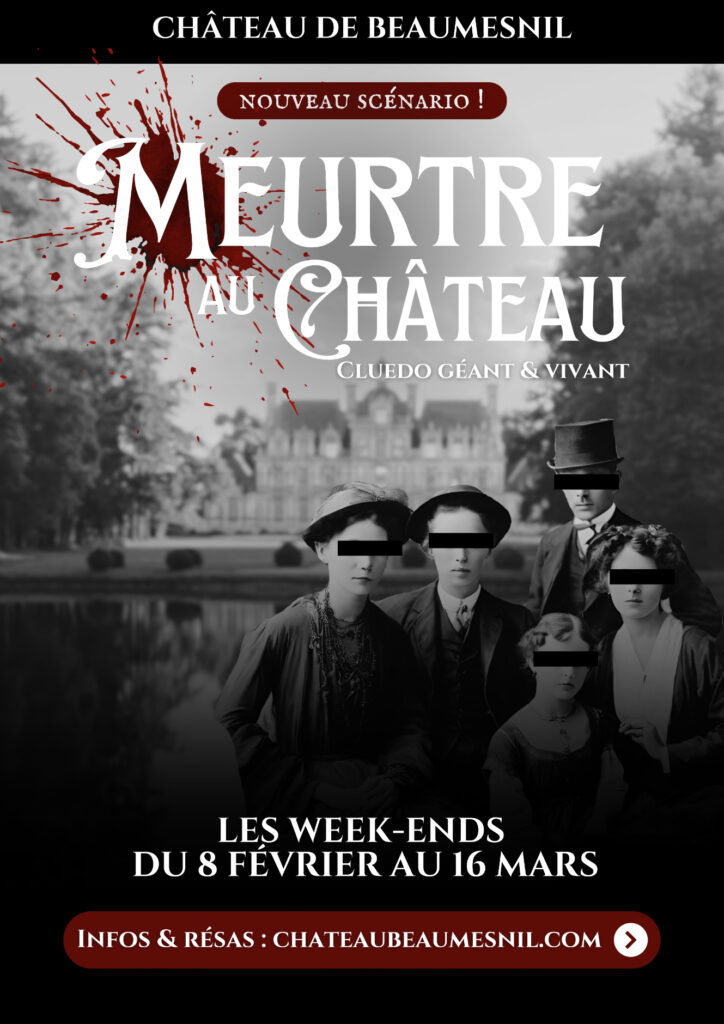 «Cluedo géant et vivant» Remontez le temps jusqu’en 1928, alors que tout Beaumesnil se prépare à accueillir la célèbre Gabrielle Chanel. Observez les salles, trouvez des indices, menez les interrogatoires des suspects et trouvez le meurtrier qui se cache au château !