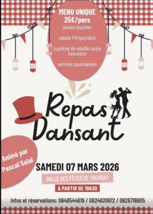 Repas Dansant Retrouvez un repas dansant, le samedi 7 mars 2026 à la salle des fêtes de Thevray à partir de 19h30. ... Le samedi 7 mars 2026 -