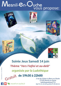 La ludothèque vous invite à sa soirée jeux » vers l’infini et au delà » le samedi 14 juin 2025 de 19h30 à 22h00.