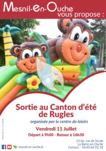 Le centre de loisirs vous propose une sortie au Canton d’été de Rugles le vendredi 11 juillet 2025 avec un départ à 9h et un retour prévu à 16h30.