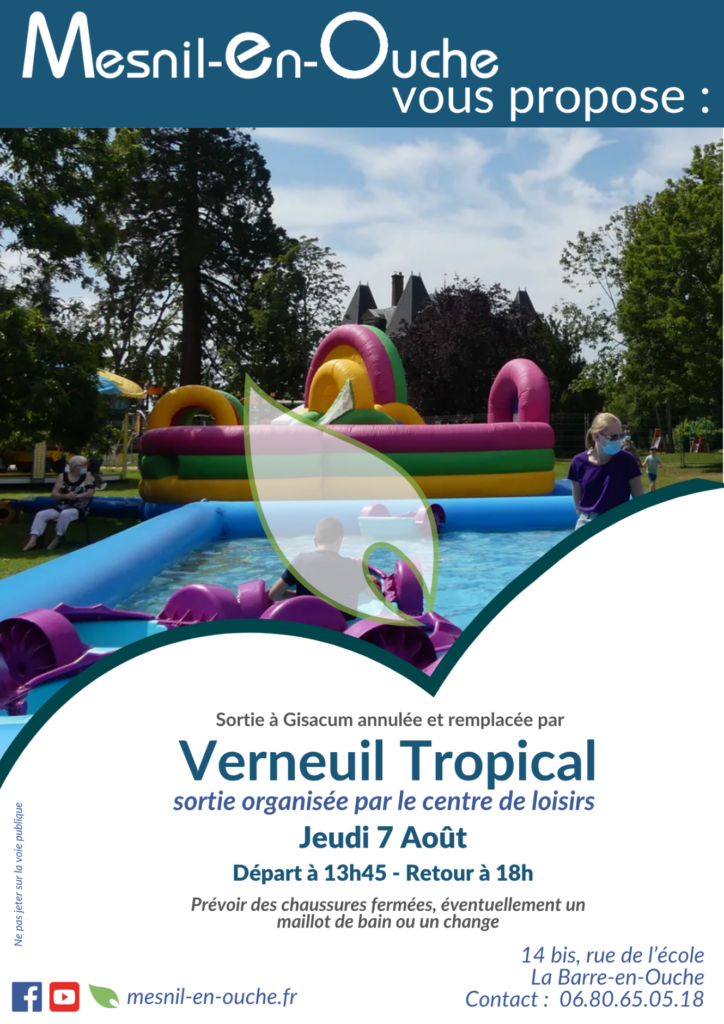 Le centre de loisirs vous propose une sortie à Verneuil Tropical le jeudi 7 août 2025 avec un départ à 13h45 et un retour prévu à 18h.