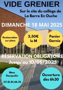 Le dimanche 18 mais 2025 le collège de Mesnil-en-Ouche vous propose un vide grenier ouvert dès 6h30.