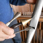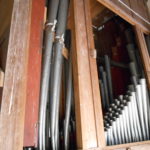 Fin avril l’artisan s’est installé pour une semaine dans la tribune de l’orgue. Il s’y est employé au démontage des différents éléments, en particulier les 400 tuyaux, qui seront ensuite nettoyés un par un dans son atelier de Pornic. Parallèlement, le facteur d’orgue a profité de cette semaine pour se consacrer à l’aspect mécanique (clavier, pédalier, et les huit tirants de jeu). Un traitement xylophène a été appliqué, et le passionné a décidément pu constater la qualité du travail de menuiserie réalisé par les frères Damien 150 ans plus tôt. Dominique Gervais a enfin changé l’ensemble des garnitures (cuirs, peaux, feutres). Car le métier de facteur d’orgue possède de multiples dimensions. Il conduit à manipuler toutes sortes de matériaux, la dimension artistique couronnant le tout. Avec une fascination constante pour la complexité et la perfection de l’instrument.